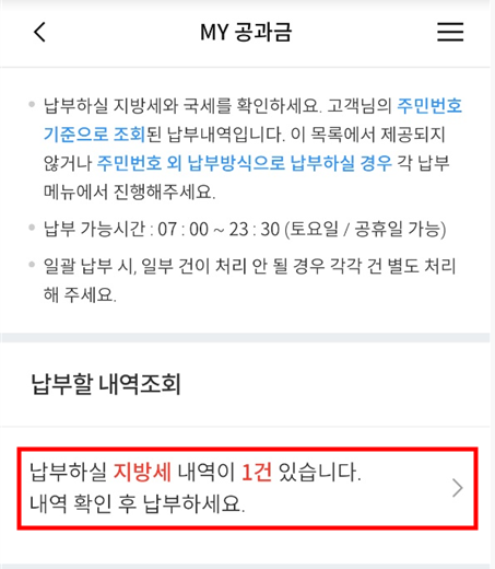 납부 가능 시간은 07:00~23:30분 (토요일/공휴일 가능) 이니