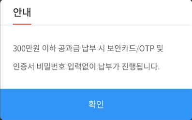 300만원 이하 공과금 납부 시 보안카드/OTP 및 인증서 비밀번호 입력 없이