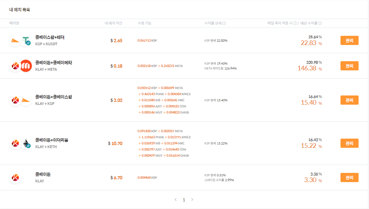 처음 투자 하는 것이라 페어예치의 이율이 마음에 들어서 대부분의 코인을 페어 예치로 투자를 진행하였다.