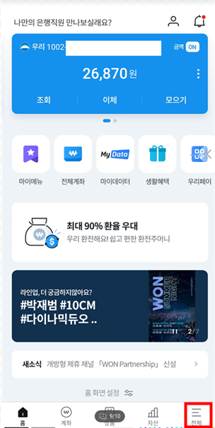 앱 접속 후 최초 화면에서 전체 부분을 눌러줍니다.