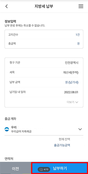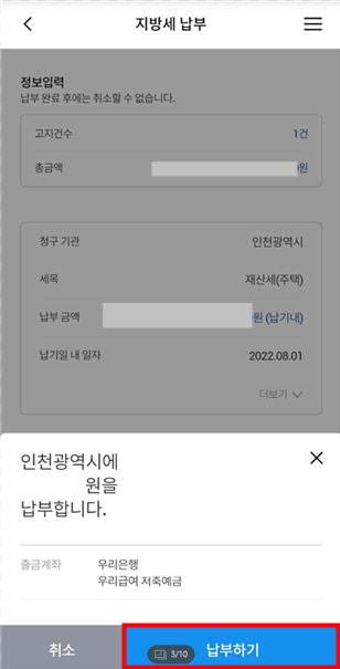 문제가 없다면 하단의 납부하기 부분을 눌러줍니다.