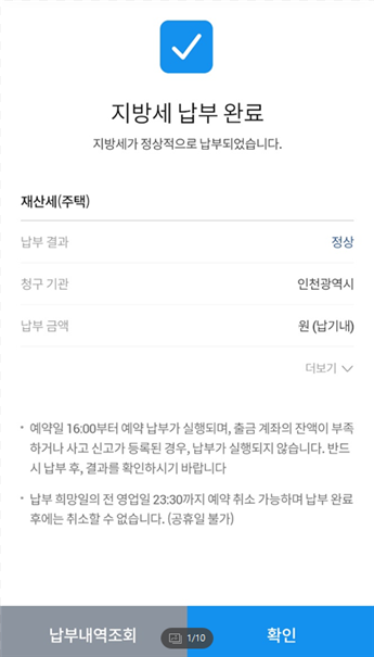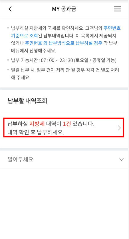 납부할 내역 조회의 다음과 같은 메시지가 나타납니다.