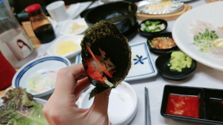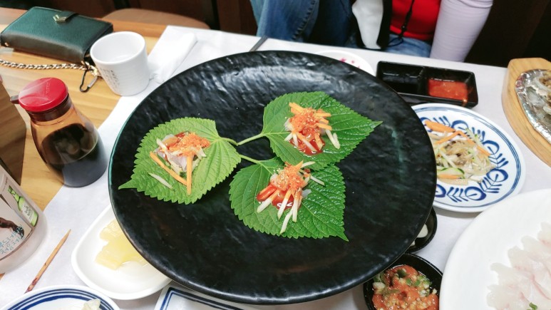 깻잎쌈인데,, 정확히 어떤 회인지는 모르겠으나, 깻잎향과 회의 초장의 3박자가 잘 어우러졌던거 같습니다.