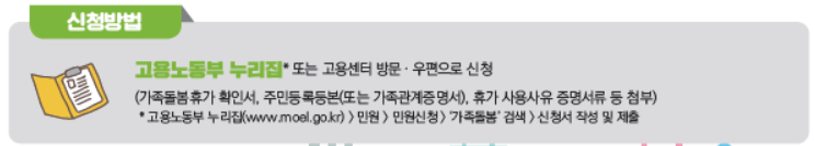 *고용노동부 누리집(www.moel.go.kr) > 민원 > 민원신청 > 가족돌봄 검색 > 신청서 작성 및 제출